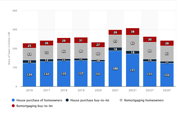 3. https://www.statista.com/statistics/429086/home-purchase-moving-remortgage-loans-value-uk/ - According to the forecast, the total value of mortgage lending in the United Kingdom (UK) will reach 247 bn British pounds by 2024. House purchases by homeowners comprise the largest share of lending. In 2024, this type of mortgages are expected to reach 122 bn British pounds.