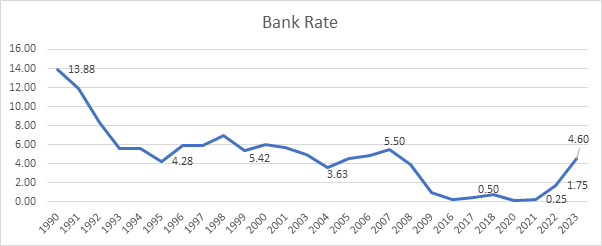 1. https://www.bankofengland.co.uk/boeapps/database/Bank-Rate.asp - shows the Bank of England's Bank Rate from 1990 until 2023.