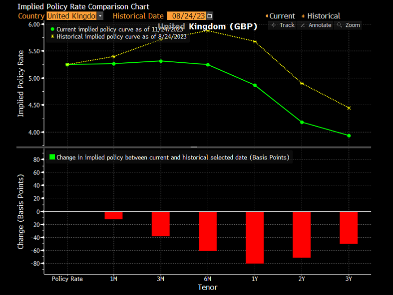 2. The Bloomberg data here shows the latest projections for UK Interest Rates various economists. UK interest rates have now likely peaked at 5.25% and are expected to remain around the current level for some time. They are not expected to rise further - unless UK inflation remains high - and are predicted to start falling in the second half of 2024.